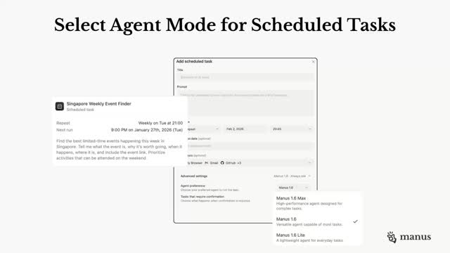 Manus는 최근 작업별 이벤트 직접 선택 기능을 업데이트하며, AI 에이전트의 자율성과 제어 가능성 사이의 균형을 새롭게 정의했습니다. 이전까지 에이전트는 사용자의 의도를 해석하여 적절한 행동을 취했으나, 이제는 프로젝트마다 최적의 이벤트를 사전에 설정할 수 있게 되었습니다. 이는 Skills와 MCP (Model Context Protocol)를 결합한 예약 기능의 핵심입니다.